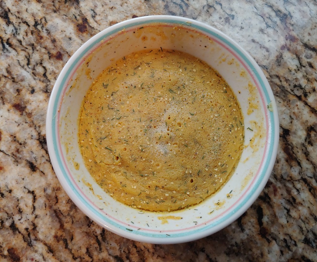 - Combine all ingredients for the chickpea eggs (except the extra tbsp. of water) into a microwave safe bowl. Heat for a 1.5 minutes or until the batter no longer looks wet. Place in the refrigerator while you prep everything else