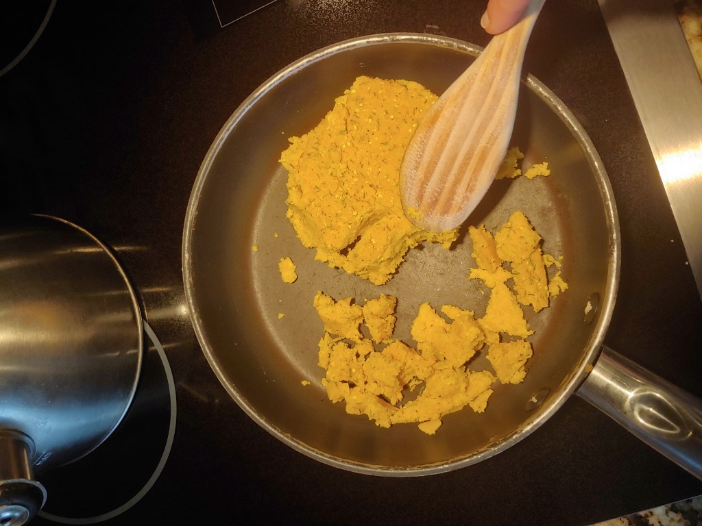- Remove the chickpeas batter from the fridge and place in a pan on medium high heat. Break apart with a spatula into a crumbled texture and add extra tbsp of water. Cook for 5 minutes to reheat and cook off water