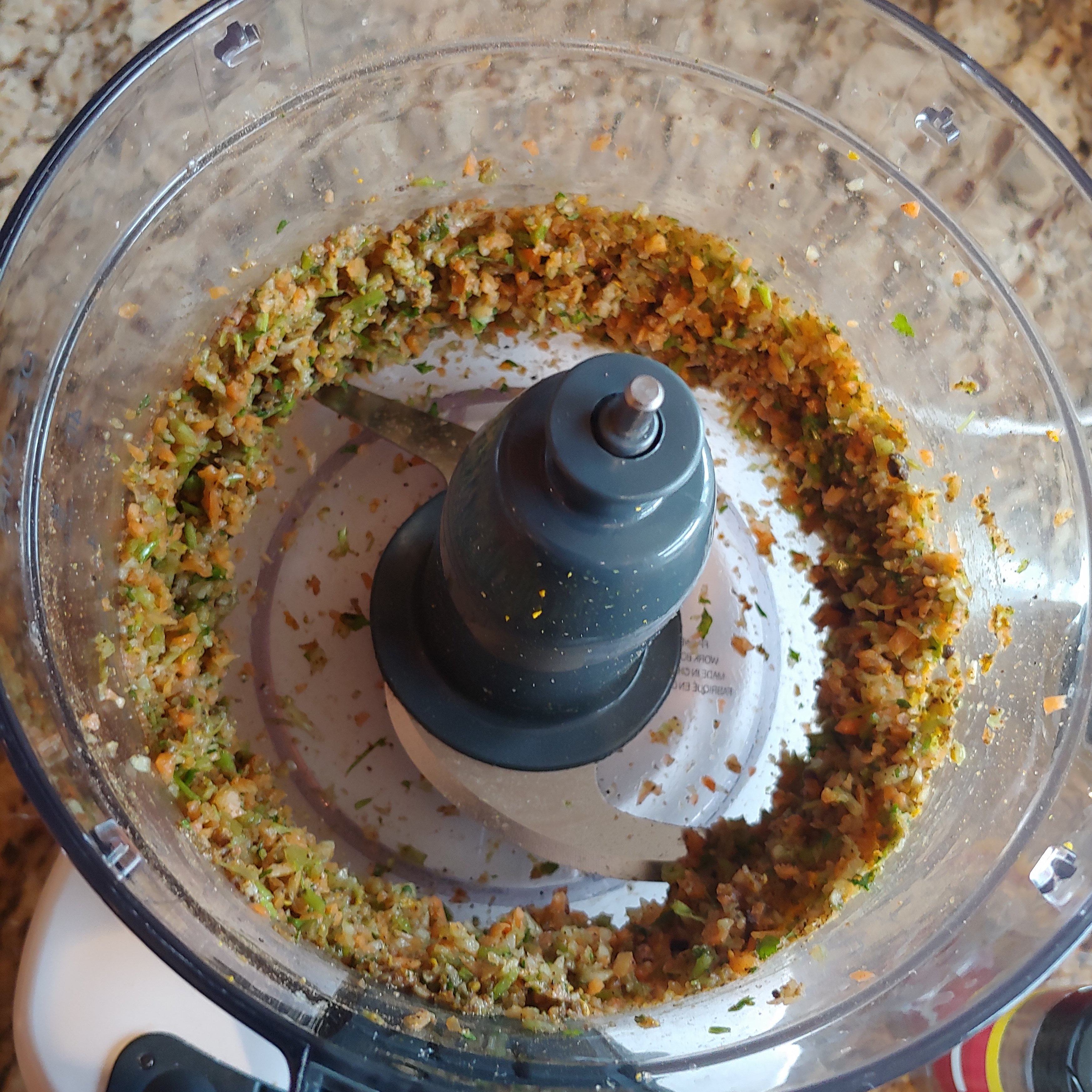 - Place celery, carrots, cilantro, green onion, garlic, and spices into the bowl of a food processor and blend until everything is very finely chopped. You may need to scrap down the sides. Doing this step before the chickpeas makes sure you don’t get big celery chunks in your falafel