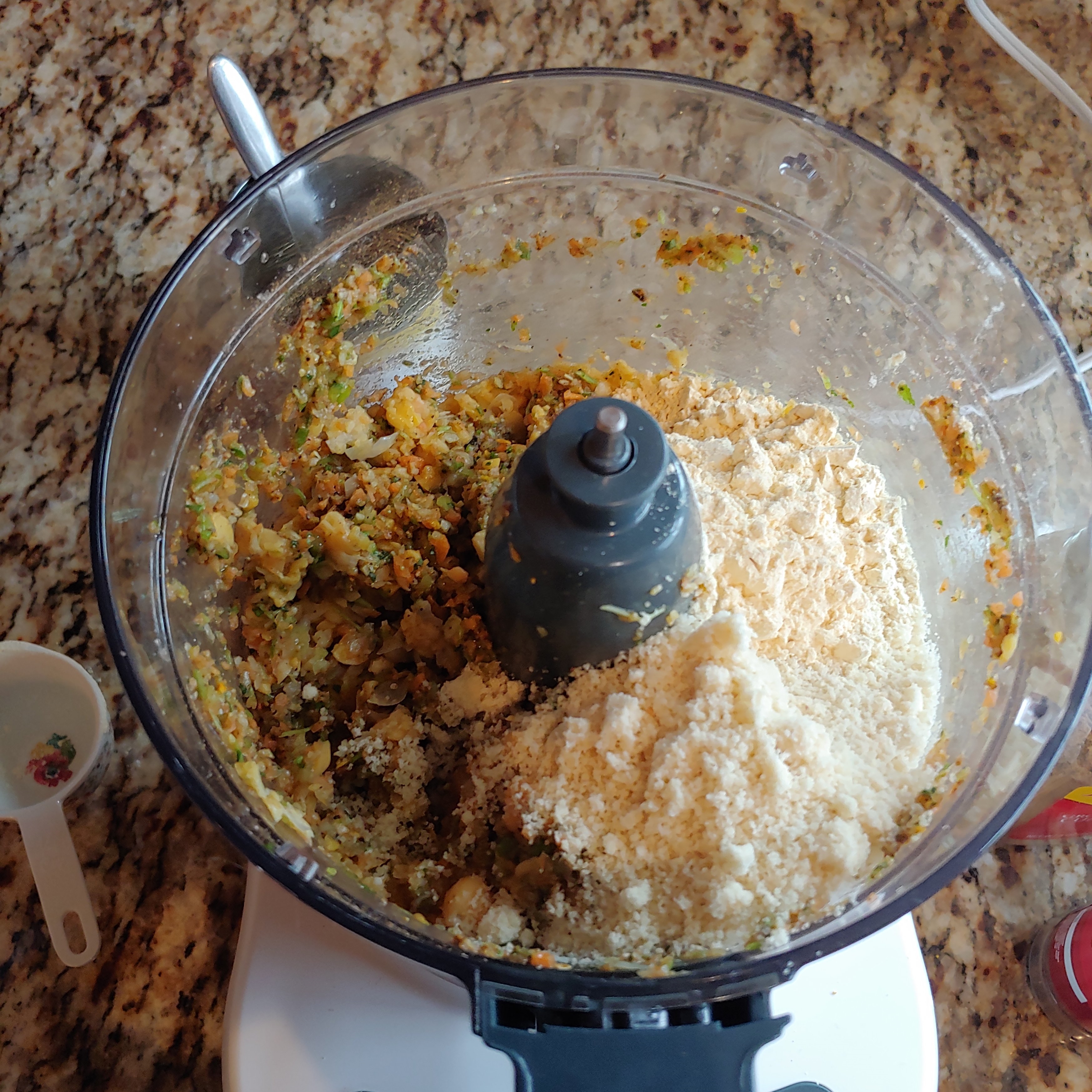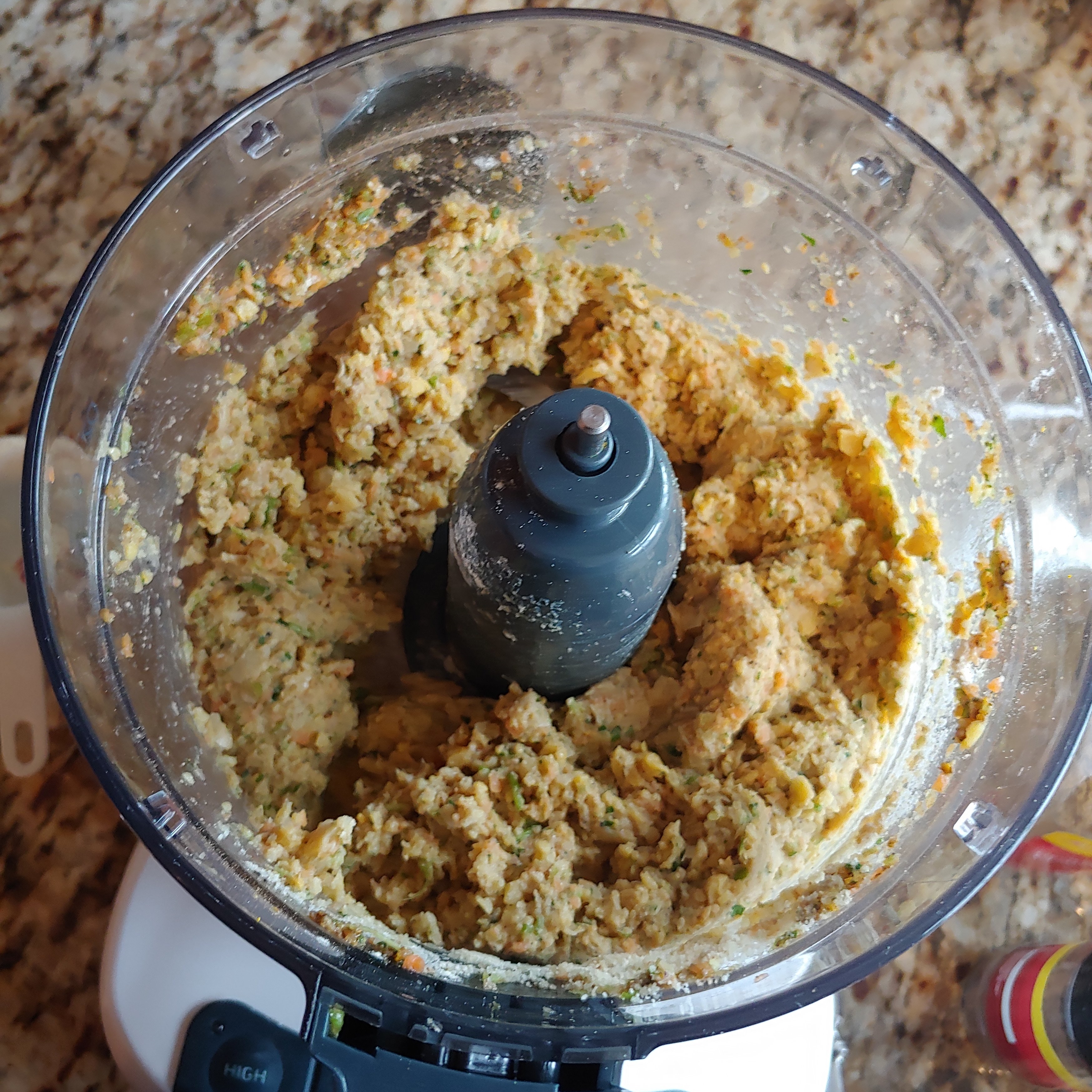 - Add the remaining ingredients (flours, chickpeas, and baking soda) to the food processor and blend/pulse until the chickpeas are well chopped but not pasty. If it goes to long it will become humus and won’t hold up as well in the fryer. At this stage the dough should hold itself together well. If it seems too dry/wet add water/flour to adjust.