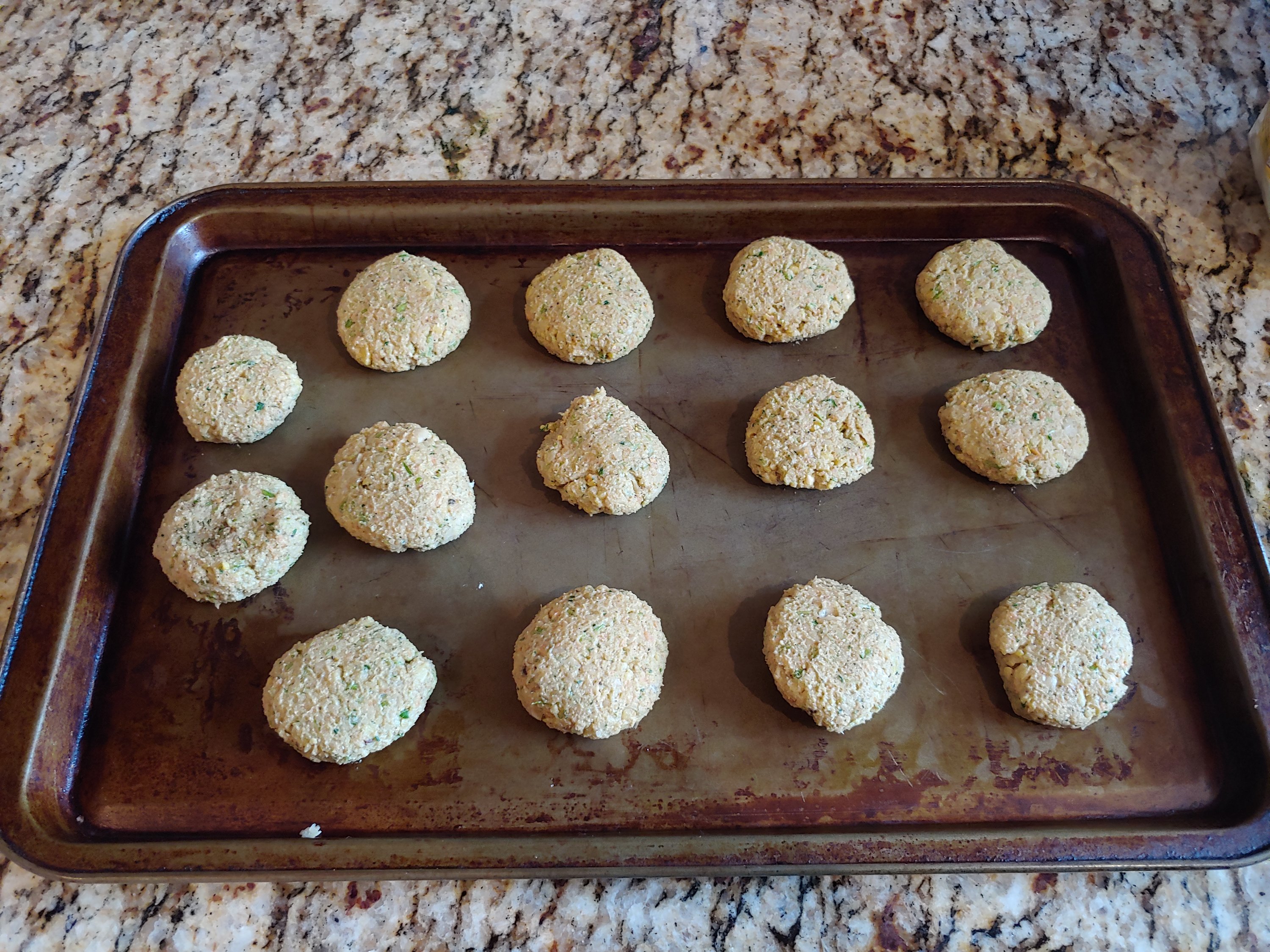 - Prepare a baking tray with parchment paper. Roll spoonfuls of falafel dough into balls and then flatten into disks – place these in the freezer for at least 1 hour. Freezing helps them hold up in the fryer.