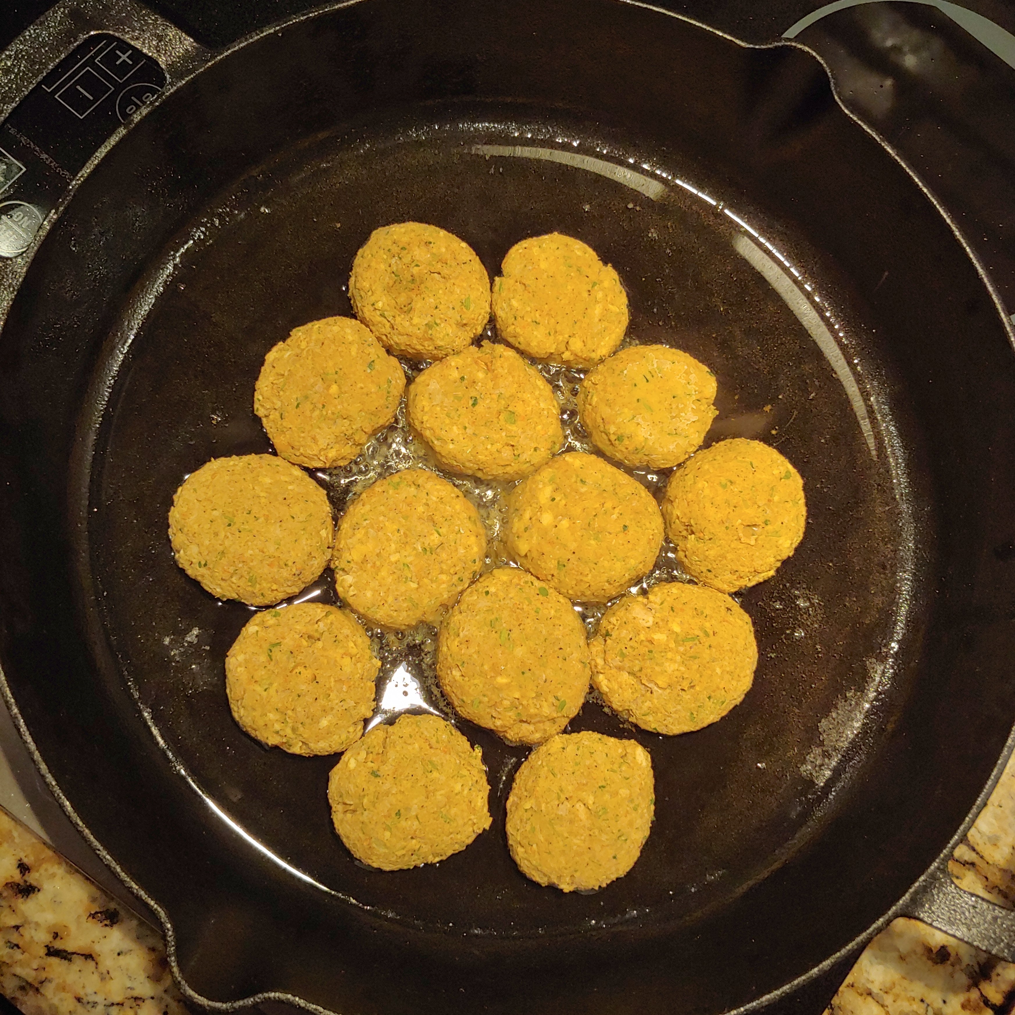 - Remove the falafel from the freezer and drop into the oil – cook for 2 – 3 minutes on each side. Place falafel on a drip pan or paper towels