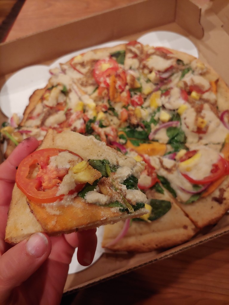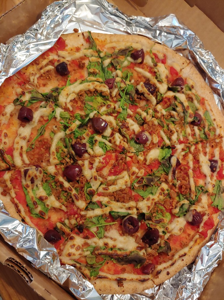 The first time I went I got The Vegan Supreme : tomato sauce base, housemade cashew cheese, veggie sausage, bell peppers, red onions (top of page). I subbed the peppers for olives however. The crust had a really nice flavor and chewy texture, but was a bit under done. I also actually enjoyed the vegan meat crumbles. The texture was undetectable and the flavor was subtle yet had a nice ‘Italian Sausage’ (aka fennel heavy) taste. The sauce was sweet yet hearty and the cashew cheez was a nice addition, but there definitely could have been more of it.