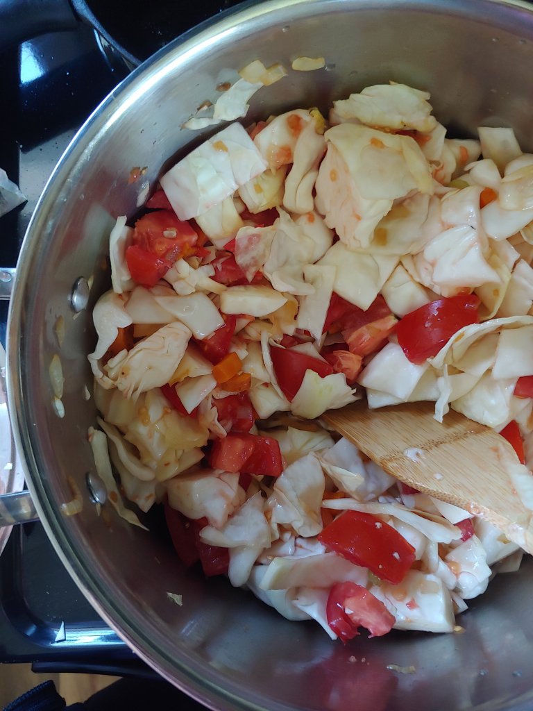 - Stir in tomatoes, cabbage, and hot pepper. You may wish to add a tablespoon or two of water to prevent sticking/burning. Stir and cover, cooking on medium-low for 10 minutes.
